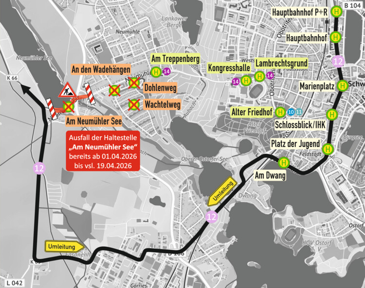 aufgrund von Straßenbauarbeiten kommt es von Mittwoch, dem 1. April 2026, 04:00 Uhr bis Sonntag, dem 19. April 2026, 24:00 Uhr auf den Linien 12 und 13 zu Behinderungen im Bereich der Neumühler Straße (Brücke Umgehungsstraße).