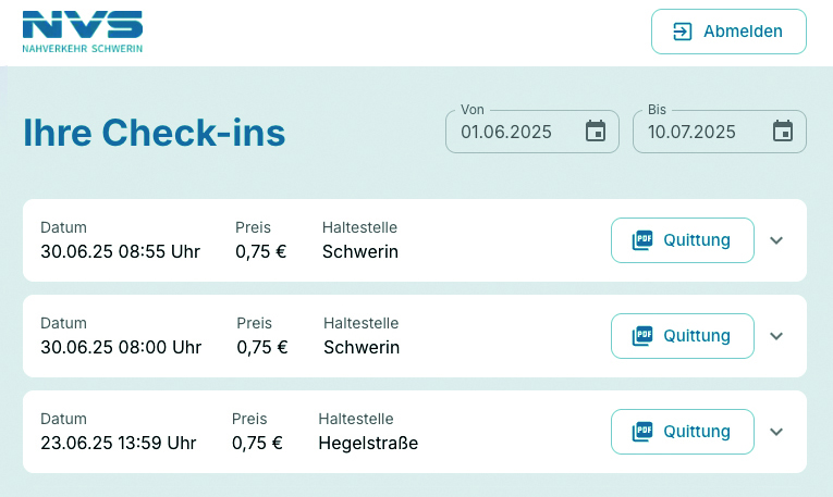 Fahrgäste können die Gültigkeit ihres Tickets live am Gerät abfragen. Zudem bietet das Online-Kundenportal eine Übersicht über alle getätigten Fahrten und Belege. Für die Kontrolle der Fahrtberechtigung nutzen Kontrolleure mobile Lesegeräte, die prüfen können, ob für die jeweilige Zahlungs-ID eine gültige Fahrt hinterlegt ist.